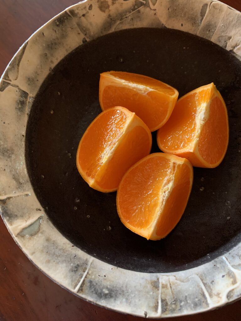 2024年の収穫は「せとか」が2つと「はるみ」が7つ。はるみは初めて実がなった。橙色のかわいいみかんはお正月の鏡もちの上に飾りました。